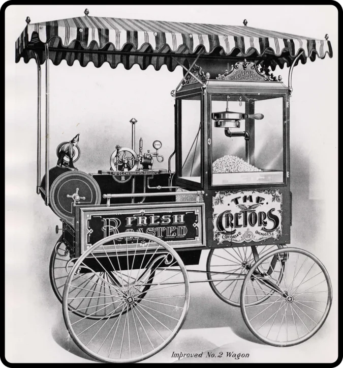 When the first steam-powered popcorn machines appeared in 1885, they were designed to travel from town to town, popping fresh corn right on the street.